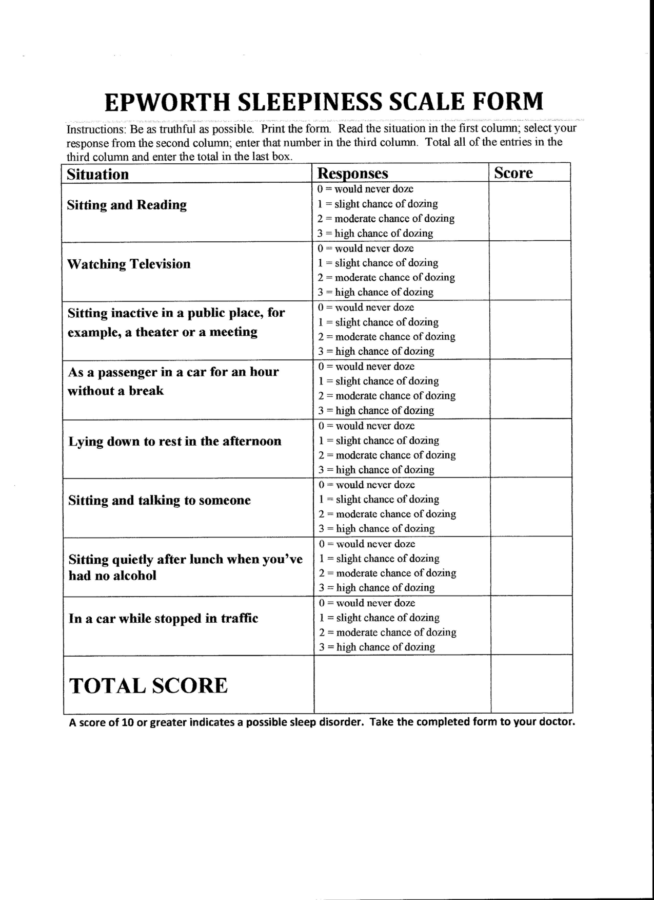For other ways to identify problematic. The epworth sleepiness scale can be used to assess daytime sleepiness. Here is a printable version of the epworth sleepiness scale.