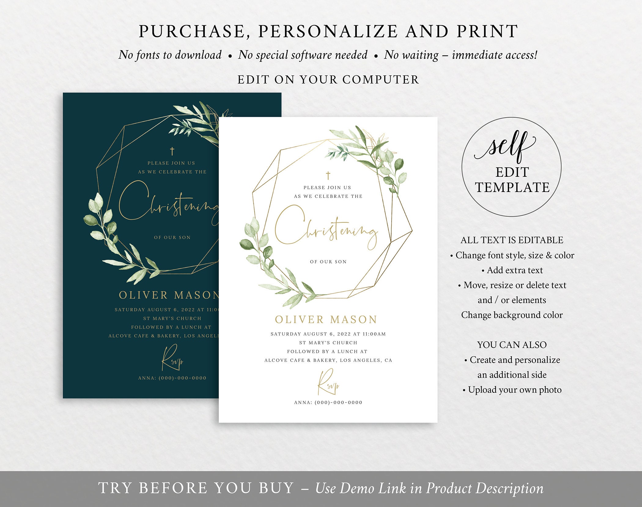 Christening Invitation Template, Greenery & Gold, Demo Available