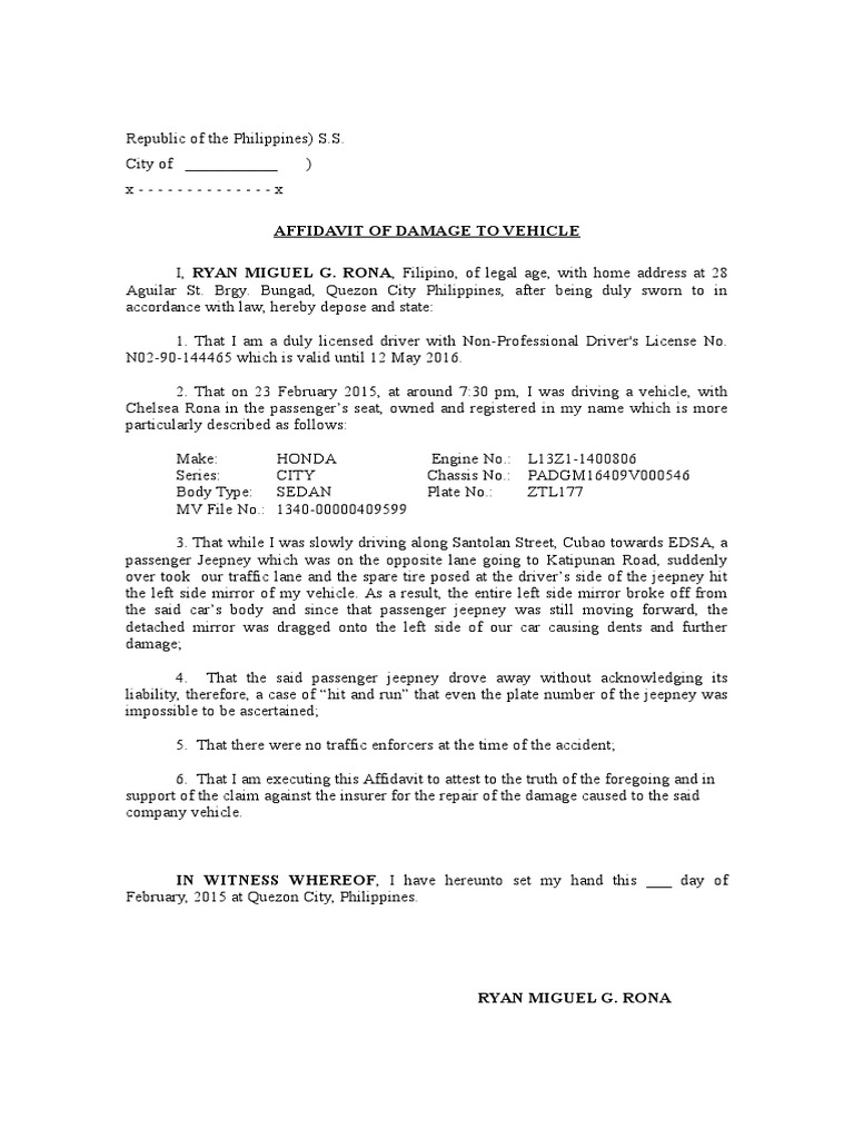 Affidavit of Damage to Vehicle
